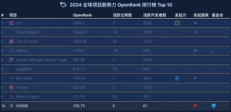 国内唯一上榜!KWDB 数据库入选“2024 全球新势力项目 OpenRank Top10”