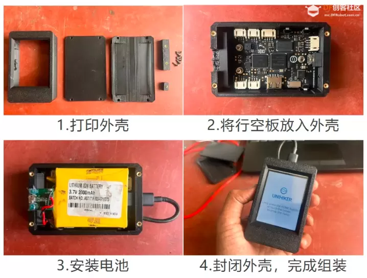 使用Fusion设计WatchHIKER的外壳,作者在背壳上预留了方便腕带穿过的空隙。打印完成后,将行空板M10以屏幕朝外的方向放入外壳内,接下来,连接电池到充电器模块,将组装完成的电池组安装在外壳里。完成以上步骤后,封闭外壳。最后给手表加上表带,作者选择的是“魔术贴”腕带。