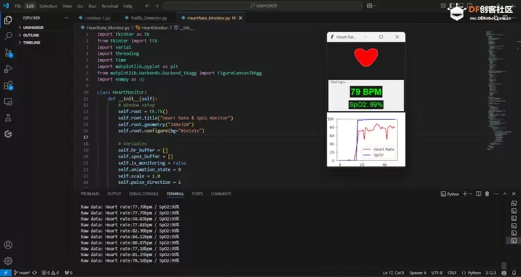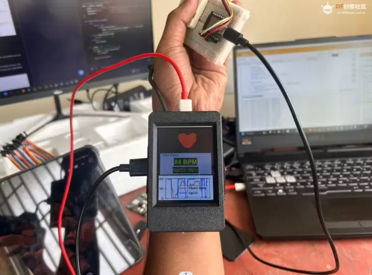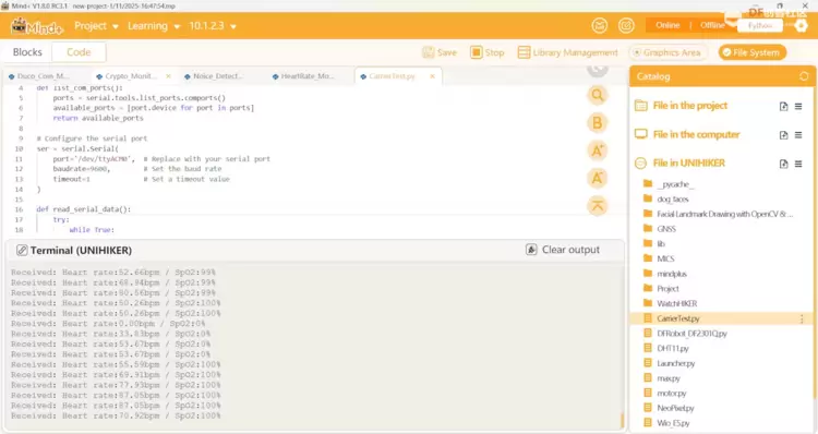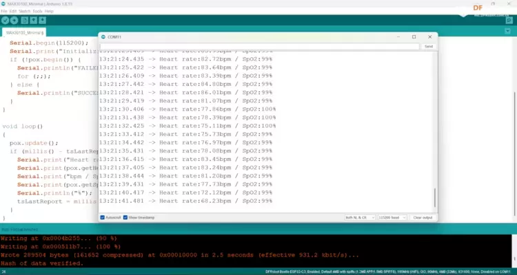 首先将Beetle ESP32 C3编程,让它通过I2C通信从心率传感器读取数据,并将其写入串行端口。这样,行空板就可以读取并绘制血氧饱和度和心率数据了。