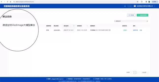 2024年,德适生物经过多年潜心研发的iMedImage®医学影像大模型算法,成功获得国家互联网信息服务算法备案,并通过中国信通院评测。