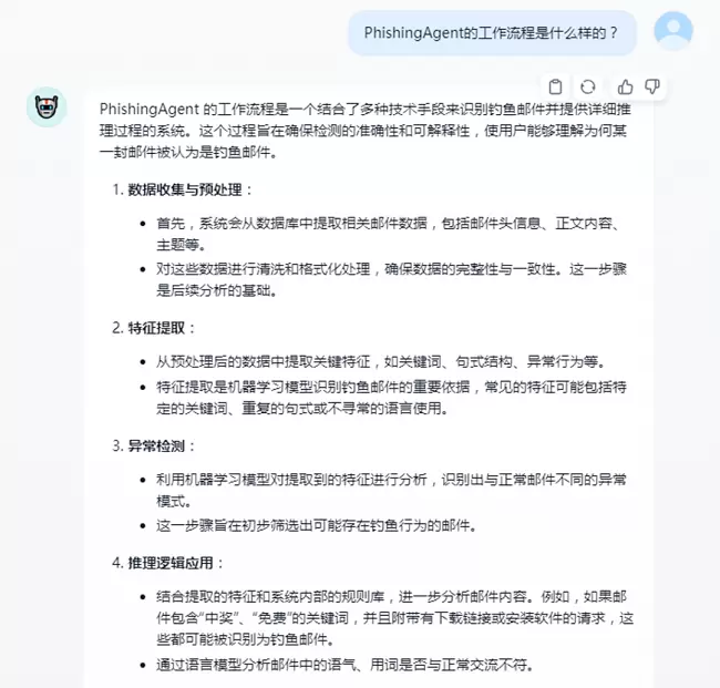 值得一提的是,方正鸿云还与工信科技期刊集群合作,对本地部署版DeepSeek的对话效果进行了验证。DeepSeek通过学习本地知识库内容,成功识别并解释了PhishingAgent这一专业术语,即一种钓鱼邮件识别系统,并结合学术论文内容对其工作流程进行了概述。这一成果充分展示了DeepSeek在学术领域的应用潜力和价值。(备注:“PhishingAgent”来源于发表在《通信学报》2024年 45卷 第Z2期的《基于智能体工作流的高级钓鱼邮件检测方法》内容,由北京大学计算中心的研究学者设计。)