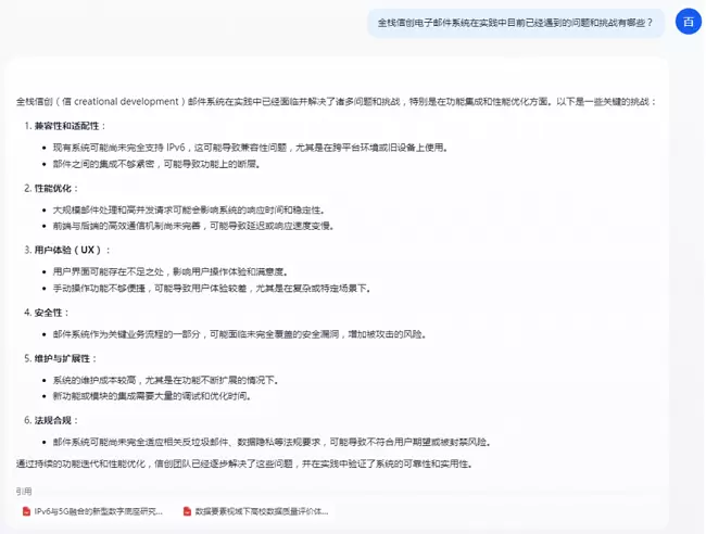 此外,本地部署版DeepSeek还展现出了强大的内容整合能力。在面对“关于电子邮件系统在信创环境下实践中遇到的问题”时,DeepSeek能够整合多篇文档的内容,给出全面而准确的答复,并提供了信源文档供读者参考。这一功能无疑将大大提升学术期刊的审稿效率和内容质量。相关验证对话截图如下: