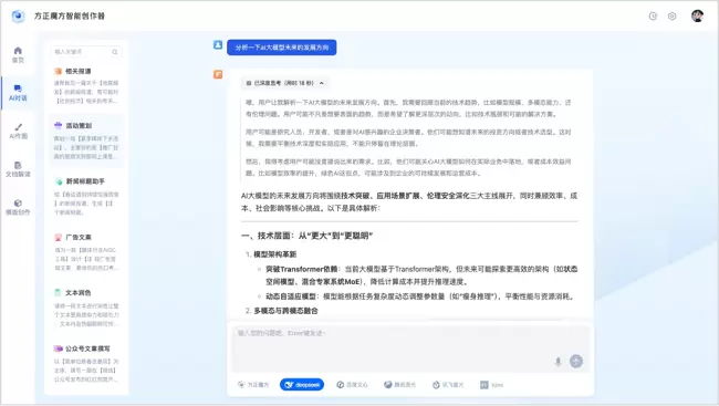 此次通过与DeepSeek的深度对接,引入DeepSeek的先进架构和技术,使方正魔方媒体大模型在自然语言处理、多模态融合、深度推理等方面实现了质的飞跃,进一步提升了模型的性能和智能化水平,以更高的效率和更精准的结果为媒体行业提供支持。