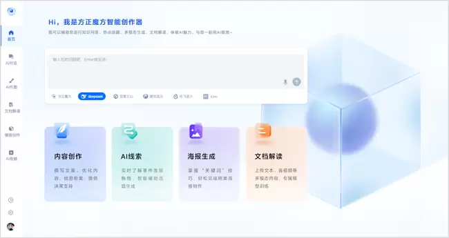 方正电子自主研发的媒体AIGC大模型“方正魔方智能创作器”已完成DeepSeek全系列模型的深入对接,帮助用户更精准地解析复杂数据,提供更科学的决策支持,助力内容生产和传播智能化,同时为主流媒体提供更高效的运营和管理方式。现在,用户打开魔方智能创作器即可体验和使用。