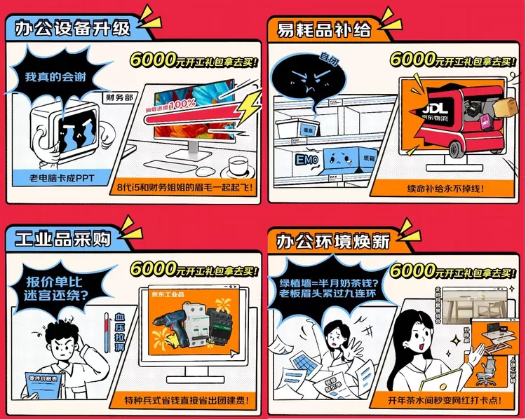 易耗品补给方面,清洁纸品、办公耗材、办公文具、财会用品、清洁耗材等应有尽有;智能办公升级方面,电脑整机、打印设备、会议大屏等高性价比设备一键配齐,助力高效复产;工业品精准补给方面,五金工具、工服定制、生产物料等专业物资联合品牌直供,保障产线运转;职场环境焕新方面,空调、办公家具、清洁耗材等品类全覆盖,打造舒适生产环境。针对员工福利、企业用酒、企业养车、员工健康等细分场景,京东持续为企业客户提供一站式「商品+服务」采购解决方案。