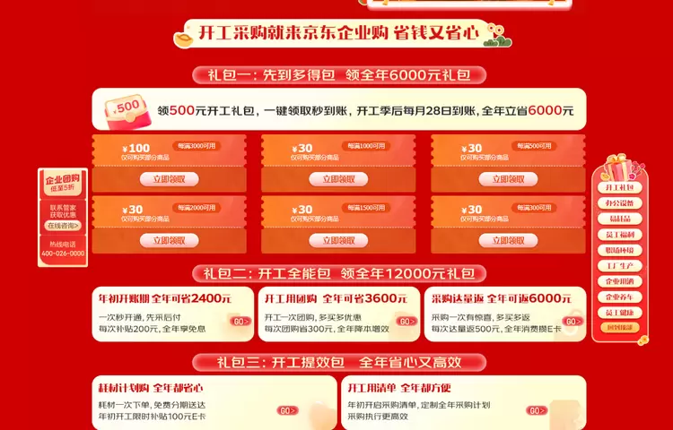 针对政企开工季集中采购的资金痛点,京东企业购推出多项降本专项支持,如企业用户一键领取 500 元开工礼包,开工季后每月 28 日到账,全年立省 6000 元。此外,多买多优惠的团购折扣、达量返、开通账期服务等,还可以为企业全年再省 12000 元。通过灵活资金方案,企业可实现「零压力采购,全年成本递减」。
