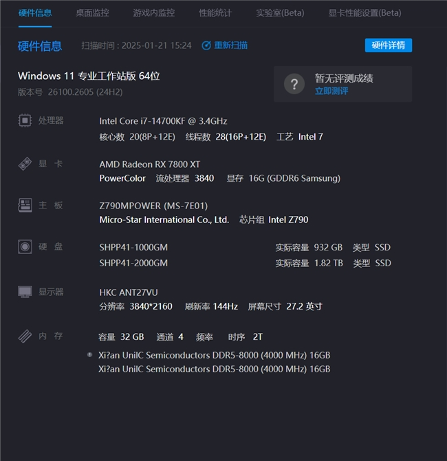 此番测试平台选用Intel i7 -14700KF搭配微星Z790M POWER主板,显卡则为撼讯RX 7800 XT,余之配件可见下图。于主板中开启XMP选项,墨云藏境系列即可轻松跃至8000 MT/s高频,时序为38-48-48-128。