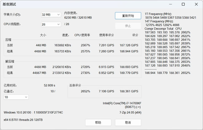 于办公场景,选用7-Zip行解压缩性能之测。墨云藏境系列总评分、使用率评分分别达到188.361 GIPS与7.106 GIPS。此项测试极为考验CPU与内存之性能,在8000 MT/s高频加持下,最终之表现同样出色。