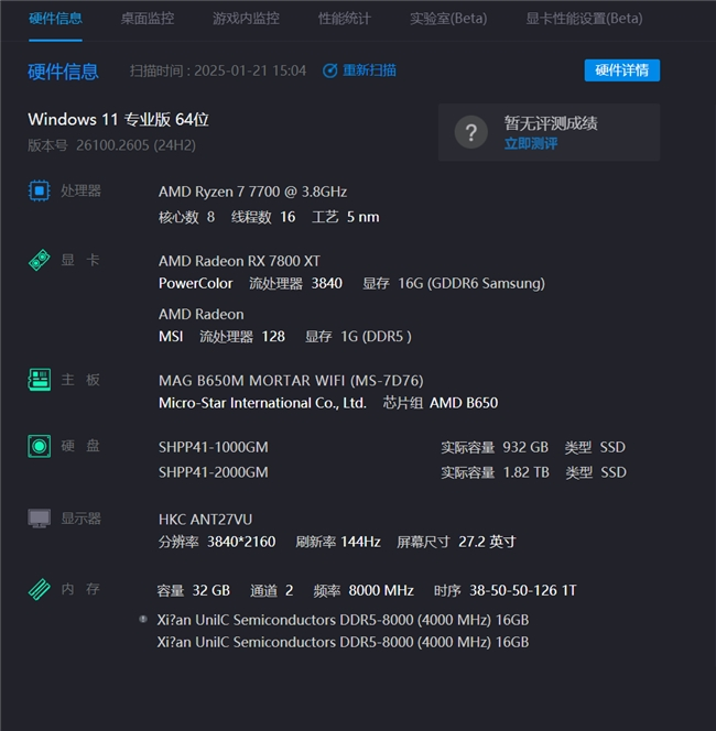 为验墨云藏境系列之兼容性表现,遂加入AMD平台对其进行测试,硬件配置为R7 7700+微星B650M MORTAR WIFI主板,余之硬件与Intel平台一致。其在BIOS中开启EXPO一键超频预设,亦同样可达8000 MT/s之高频与CL38之低延时序。