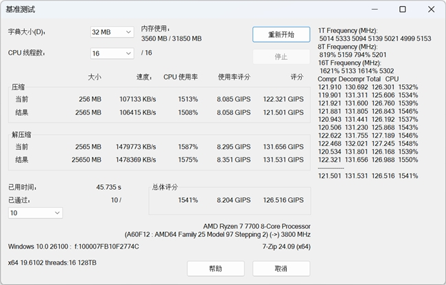 至于7-Zip解压缩性能测试,墨云藏境系列助力之下,其总评分与使用率评分,亦高达 126.516 GIPS 与 8.204 GIPS,尽显卓越之态。