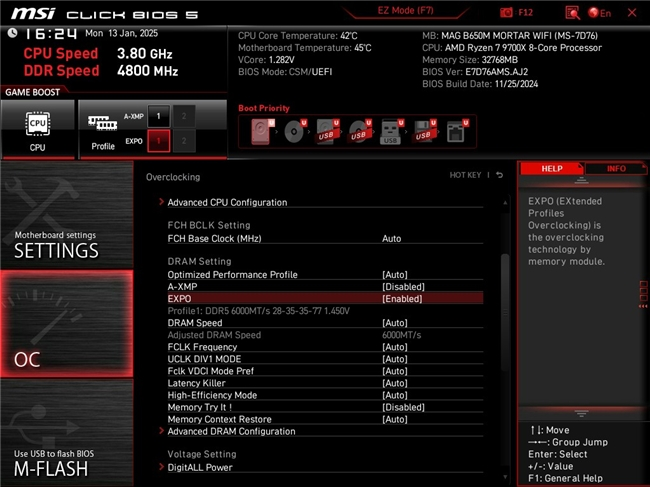 此番测试平台,以AMD R7 9700X为核心,搭配微星B650M MORTAR WiFi主板,显卡则选用撼讯RX 7800 XT 16GB。于BIOS之中,轻启EXPO一键超频设置,神凝系列如灵蛇舞动,刹那间将频率拔升至6000 MT/s,时序定格为28-35-35-77,展现超凡脱俗之性能。