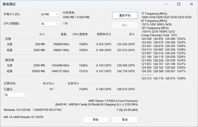 在7ZIP解压缩严苛试炼中,内存性能与CPU运算效率紧密相连,恰似唇齿相依。神凝系列内存,开启EXPO一键超频预设后,爆发出惊人力量,为这场试炼带来显著增益。此番测试,总评分高达126.015 GIPS,使用率评分亦攀升至8.19 GIPS。而CPU使用率更是一骑绝尘,飙升至1539%,于解压缩领域尽显卓越效能。