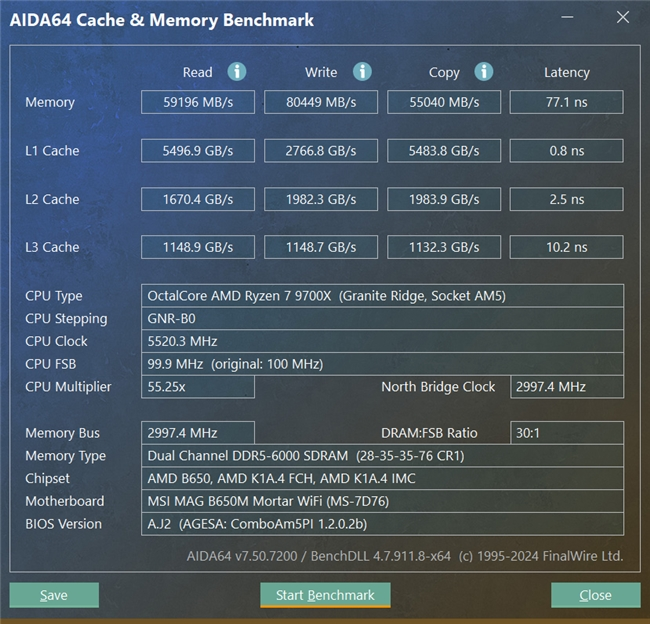 于高频之灵动与低延迟之迅捷双双加持之下,神凝系列于AIDA64内存基准测试项目中,表现颇为亮眼。其读取速度,竟达59196 MB/s;写入速度,亦有80449 MB/s;拷贝速度,更是高达55040 MB/s;而延迟,仅77.1 ns。此等佳绩,不仅彰显其超凡脱俗之性能,更预示着日后用机之体验,将有显著提升。