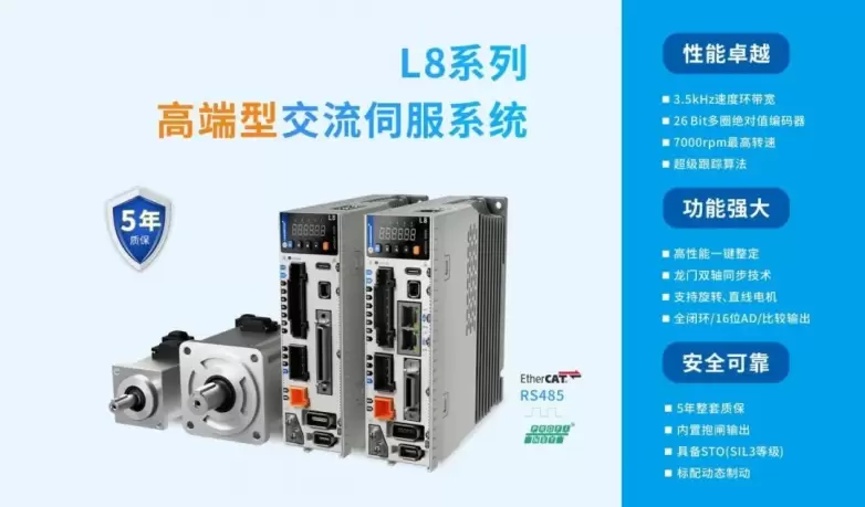 雷赛智能L8系列高端型交流伺服系统,性能卓越、功能强大、安全可靠、体积小巧,提供5年整套质保服务。L8系列采用最优 PID 算法完成 PWM 控制,3.5kHz速度环带宽,26bit多圈绝对值电机,7000rpm最高转速,标配动态制动与直驱刹车,支持STO(SIL3等级),支持龙门同步功能,满足一流产品设计标准,适用于高端应用场景。雷赛L8系列伺服产品引领进口替代,为高端智造而生。