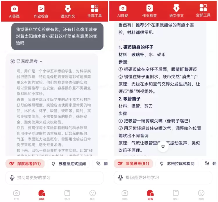 为了让中小学生也能有便捷的渠道直接感受DeepSeek的超强对话和个性化输出能力,随时问APP在首屏问答界面直接接入了DeepSeek R1,可一键启用备受好评的DeepSeek“深度思考”模式。学生可以直接询问任何学习问题,或者自由交流个人思考,均可得到及时的深度解答。