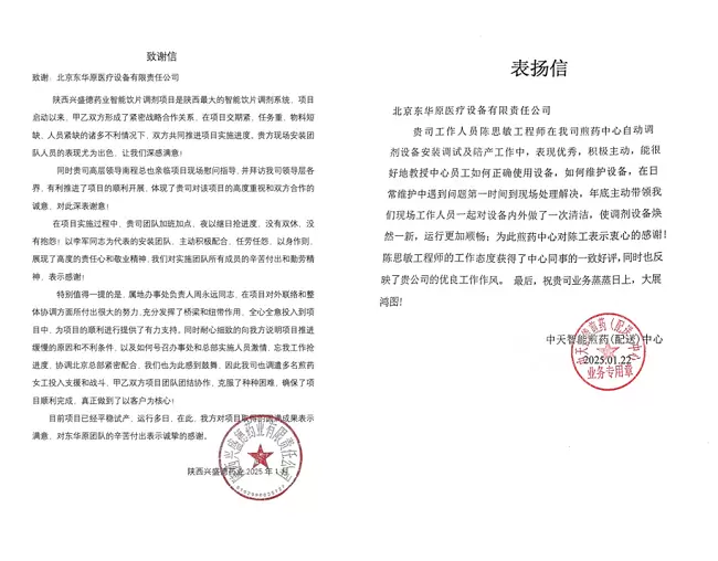 第二封表扬信来自陕西兴盛德药业,在该项目中,东华原团队面对交期紧迫、资源短缺等多重挑战,与客户紧密协同,以高效执行力与责任感推动项目成功落地。