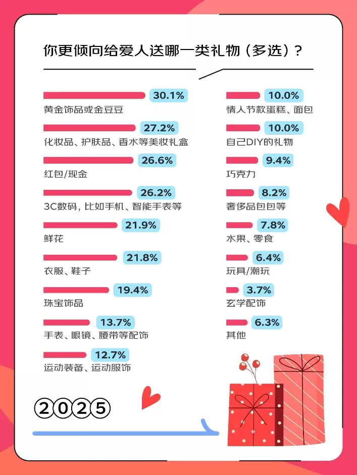 ·黄金饰品、美妆礼盒、红包是礼物 TOP3 的热门选择,3C 数码产品紧随其后,手机、智能手表等 3C 数码成为实用型礼物的选择之一,精明的年轻人表示,今年国家补贴范围拓展至更多 3C 品类,有国补补贴的礼物真香。