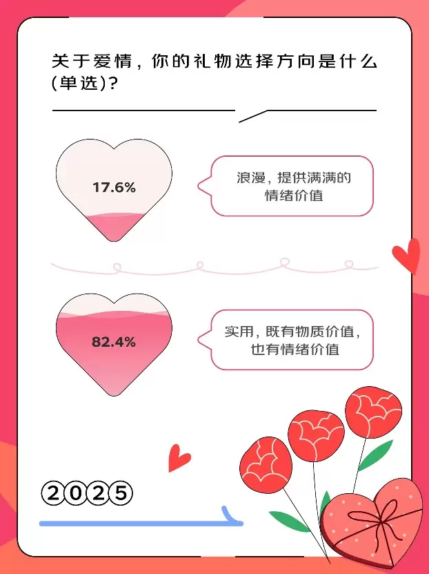 实用型礼物更受欢迎。调研显示,82.4% 的人关注礼物的实用价值,情绪价值在实用价值基础之上更让人快乐。