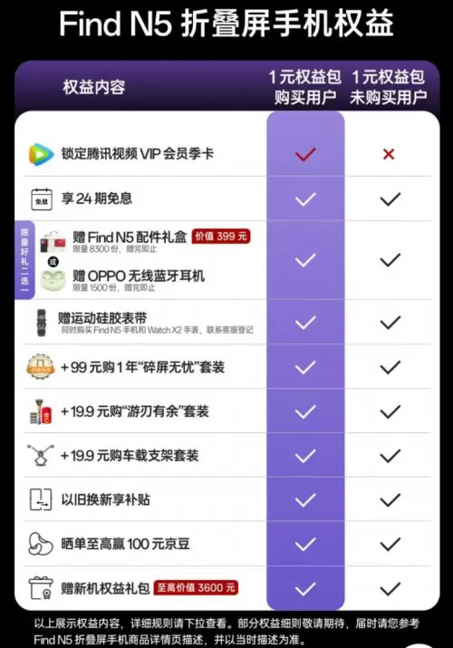 到京东APP搜索“OPPO先人一步”可进入活动页面,参与互动,有机会抽到限量0元换新机名额、以旧换新1000元额外补贴神券。同时,0元预约OPPO Find N5有机会赢新机,花1元还能提前锁定价值78元的腾讯视频VIP会员季卡,PLUS会员/店铺会员仅需0.01元即可锁定该权益。此外,参与OPPO Find N5预售还可享24期免息、购买标准版限量赠价值399元的Find N5配件礼盒或购买指定套装赠OPPO无线蓝牙耳机、以旧换新享补贴、晒单至高赢100元京豆、赠至高价值3600元的新机权益礼包,加99元享1年“碎屏无忧”套装(含1年不限次碎屏保),加19.9元享“游刃有余”套装(含吉列手电混动剃须刀),加19.9元享“车载支架”套装(含先沿车载手机支架),同时购买OPPO Watch X2赠运动硅胶表带。