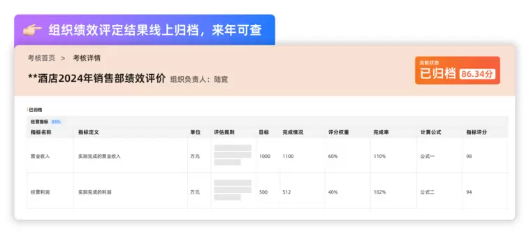绩效评定结果生成后,将被自动归档,形成组织绩效数字档案,这确保了过往的绩效情况不再只存在于员工的个体记忆或个人电脑中。通过线上统一归档,企业能够留存完整的绩效记录,为日后新战略的制定和绩效评定提供参考和依据。