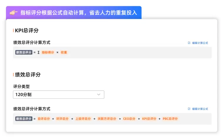 以往,绩效评定环节往往会耗费大量人力在线下反复测算核对,而Agoal支持将这一过程用公式自动计算,并支持企业对公式进行自定义设置,根据公式自动算出绩效总评分,省去人力投入成本。