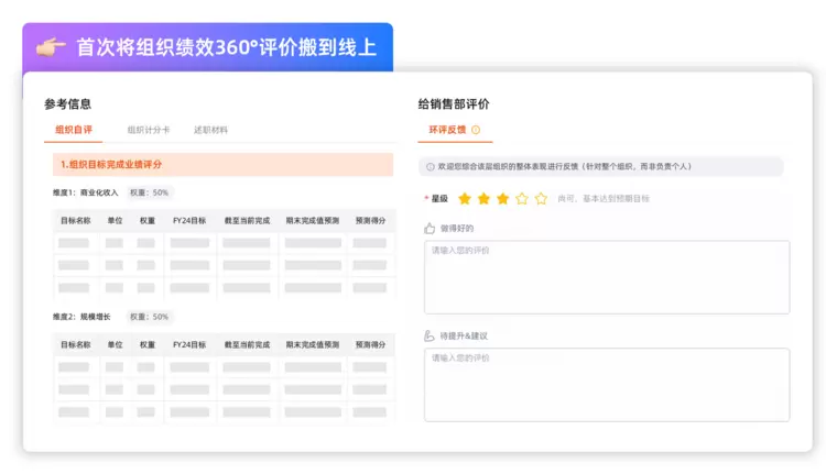 值得一提的是,组织绩效360°评价体系被首次搬到线上,个人绩效可进行360°环评,组织绩效也支持邀评,帮助企业多维视角扫除评价盲区,更客观、真实、全面地呈现组织绩效达成效果。