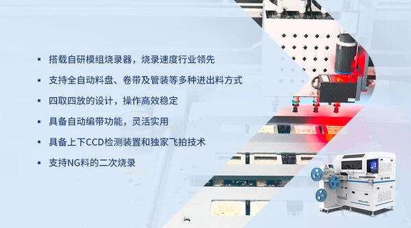 UpCore 001在技术上实现了诸多创新,设备配备了16个下压式烧录座,并采用高性能伺服系统、高精度滚珠丝杆传动或直线电机系统与高精度光栅尺等配合,确保烧录精度。同时,UpCore 001还配置了上下CCD检测装置和独家飞拍技术,可实现快速准确定位和检测吸取料件的异常情况,进一步提高生产效率。此外,设备支持离线烧录器,并支持NG料的二次烧录,有效避免因初次烧录失败导致的材料浪费。