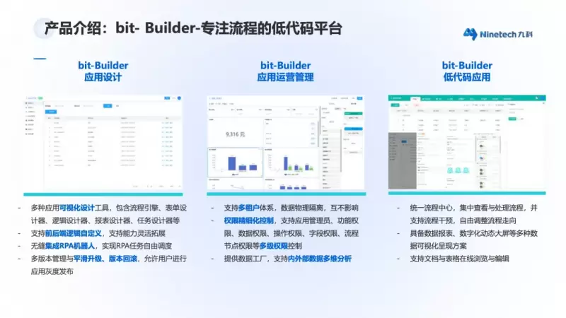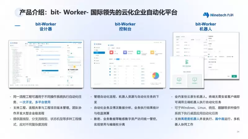 在解决了兼容问题后,九科信息根据RPA+AI、低代码以及流程挖掘技术分别推出了bit-Worker、bit-Miner以及bit-Builder三个明星产品。
