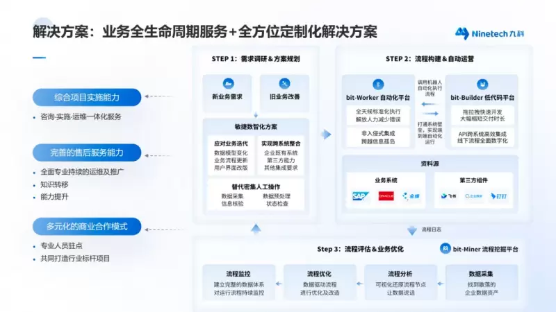 简单地来说,九科信息的综合性解决方案结合了云原生技术、RPA+AI、低代码以及流程挖掘技术。