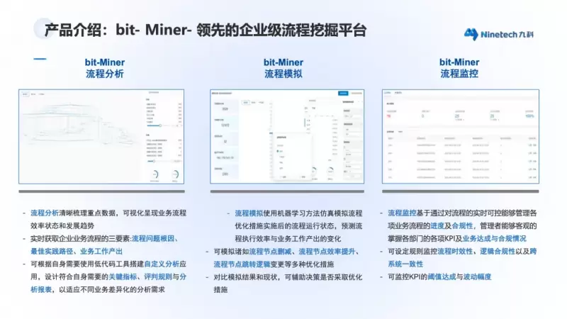 bit-Miner通过数据集成、流程分析、优化和监控,全面洞察企业业务流程的真实状况。它能发现跨系统业务流程中的瓶颈和问题,推动业务流程持续改进和优化,提升业务的处理效率。