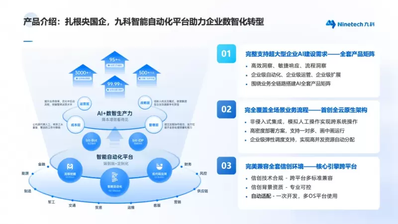 作为国央企数字化转型专家,九科信息对上述三大刚性需求有着深刻洞察:降本增效是起点,数据整合是支点,“信创”兼容是底线。