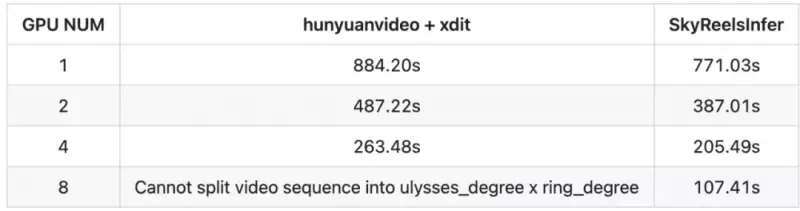 图3丨推理生成544p视频,SkyReels-Infer版本具备更鲁棒的多卡部署策略,支持8卡部署