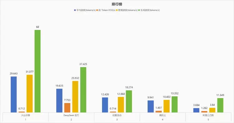 评测结果显示,在参与评测的火山引擎、DeepSeek 官方、硅基流动、腾讯云、阿里云百炼等厂商中,火山引擎表现最为突出,在 API 响应性能上全面领先,平均速度、推理速度、生成速度均为最优,可用性高达 99.83% ,是 API 接入的首选推荐。DeepSeek 官方虽推理速度较快,但首 Token 延迟长达 7.753 秒,可用性仅 42.21%,成为明显短板。硅基流动首 Token 响应快且可用性稳定,但平均速度较弱。腾讯云整体性能较低,总性能最差且可用性一般。阿里云百炼平均速度最慢,首包时间最长,不过可用性尚可。