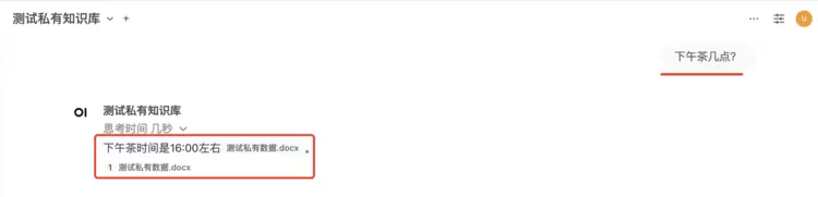 提问知识库文档内容“下午茶是什么时间?”,回答“下午茶时间是16:00 左右”。