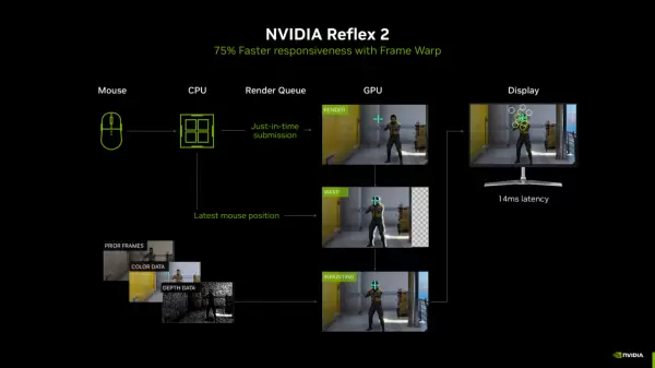 全新NVIDIA Reflex 2技术首次采用了Frame Warp技术,该技术可在渲染帧输出至显示器之前,依据实时捕捉的鼠标输入信号进行即时更新,可帮助玩家降低最高75%的系统延迟,提升游戏中的响应速度,让玩家在竞技游戏中能够更快地捕捉目标,更迅速地做出反应并提高瞄准精度。