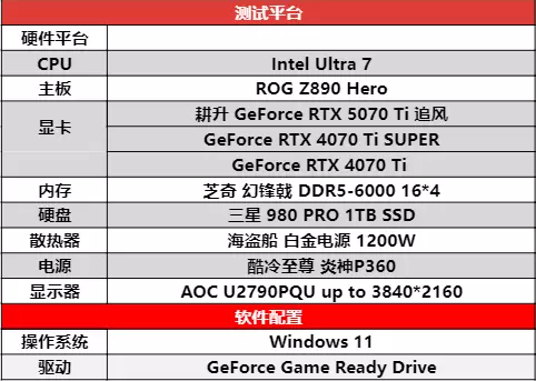 本次测试将采用以下配置:CPU选用了Intel Ultra 7,搭配ROG Z890 HERO主板,内存方面搭载了4条芝奇 幻锋戟 DDR5-6000Hz 16GB内存条,电源方面则采用了海盗船 白金1200W电源,散热部分则使用了酷冷至尊 炎神P360一体式水冷。这套经过精心设计的配置,不仅为GPU提供了高效的处理能力,还进一步稳定了显卡的温度,使得耕升 GeForce RTX 5070 Ti 追风在日常使用中得以充分发挥其高效性能。
