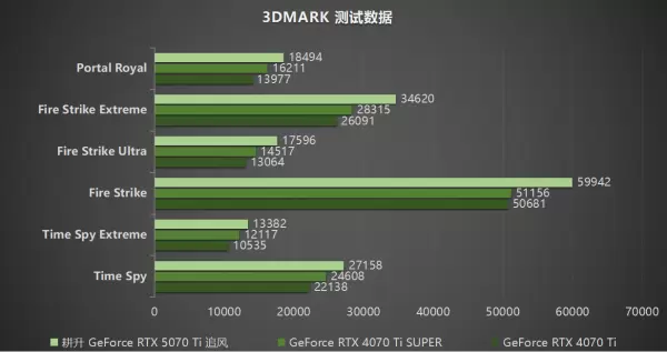 首先使用3D Mark软件对GPU进行基准测试,可以发现耕升 GeForce RTX 5070 Ti 追风在各项指标上的分数,与GeForce RTX 4070 Ti SUPER和GeForce RTX 4070 Ti相比均有显著的性能提升。尤其是在Fire Strike测试中,耕升 GeForce RTX 5070 Ti 追风的分数高达59942分,较GeForce RTX 4070 Ti SUPER和GeForce RTX 4070 Ti相比较,分别实现了17%和18%的增幅,彰显出其卓越的性能表现。总体而言耕升 GeForce RTX 5070 Ti 追风在性能表现上相较于前代显卡有显著的提升,并成功地拉大性能差距。由此可见,耕升 GeForce RTX 5070 Ti 追风的基础配置相当出色,能够满足内容创作者和高端游戏玩家的需求。