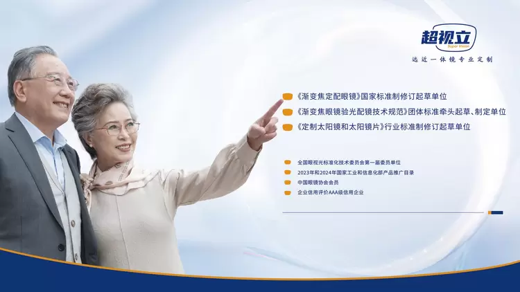 作为专注中老年定制眼镜开发与推广的全国连锁视光品牌,超视立是《渐变焦定配眼镜》国家标准制修订起草单位、《渐变焦眼镜验光配镜技术规范》团体标准牵头起草、制定单位、《定制太阳镜和太阳镜片》行业标准制修订起草单位。自2009年品牌创立以来,十五年间已在全国超过100座城市开设了逾130家门店,超视立新型定制花镜连续两年入选国家工信部产品推广目录。