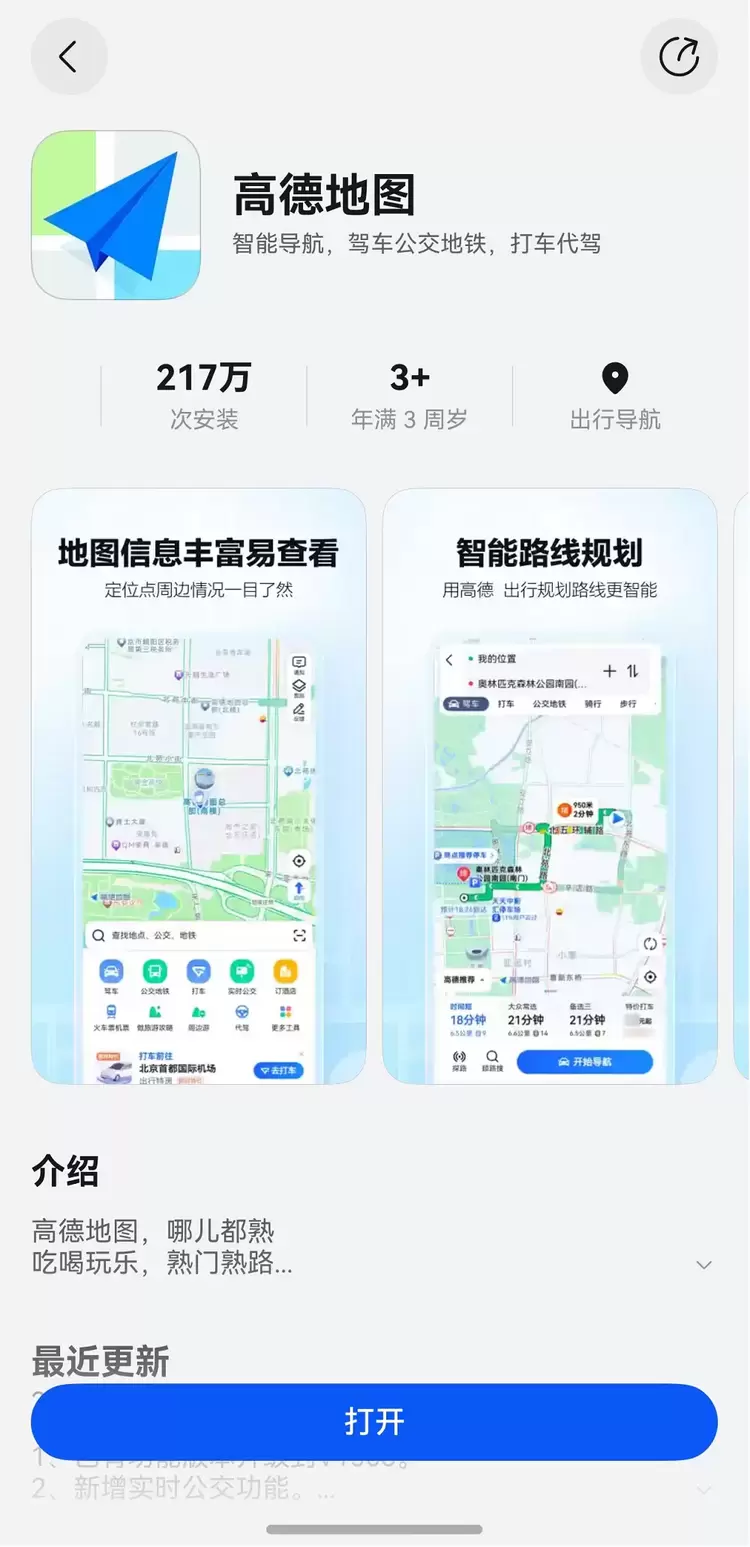 “高德地图,哪儿都熟”,作为出行领域首个启动鸿蒙原生开发的应用,鸿蒙原生版高德地图安装次数最新已达217万,也是原生鸿蒙中率先破百万的应用之一。它不仅迭代迅速、功能体验日新月异,更深度整合分布式软总线、意图框架等原生鸿蒙核心特性,实现导航跨设备流转、实况窗、语音直达服务等独有创新体验,越用越好用。