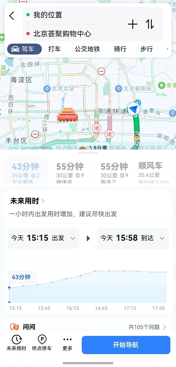 •未来用时,提前规划:用户搜索目的地并查看路线时,可查看预估到达时间,还支持选择不同出发日期和时间,查看对应的预估到达时间。
