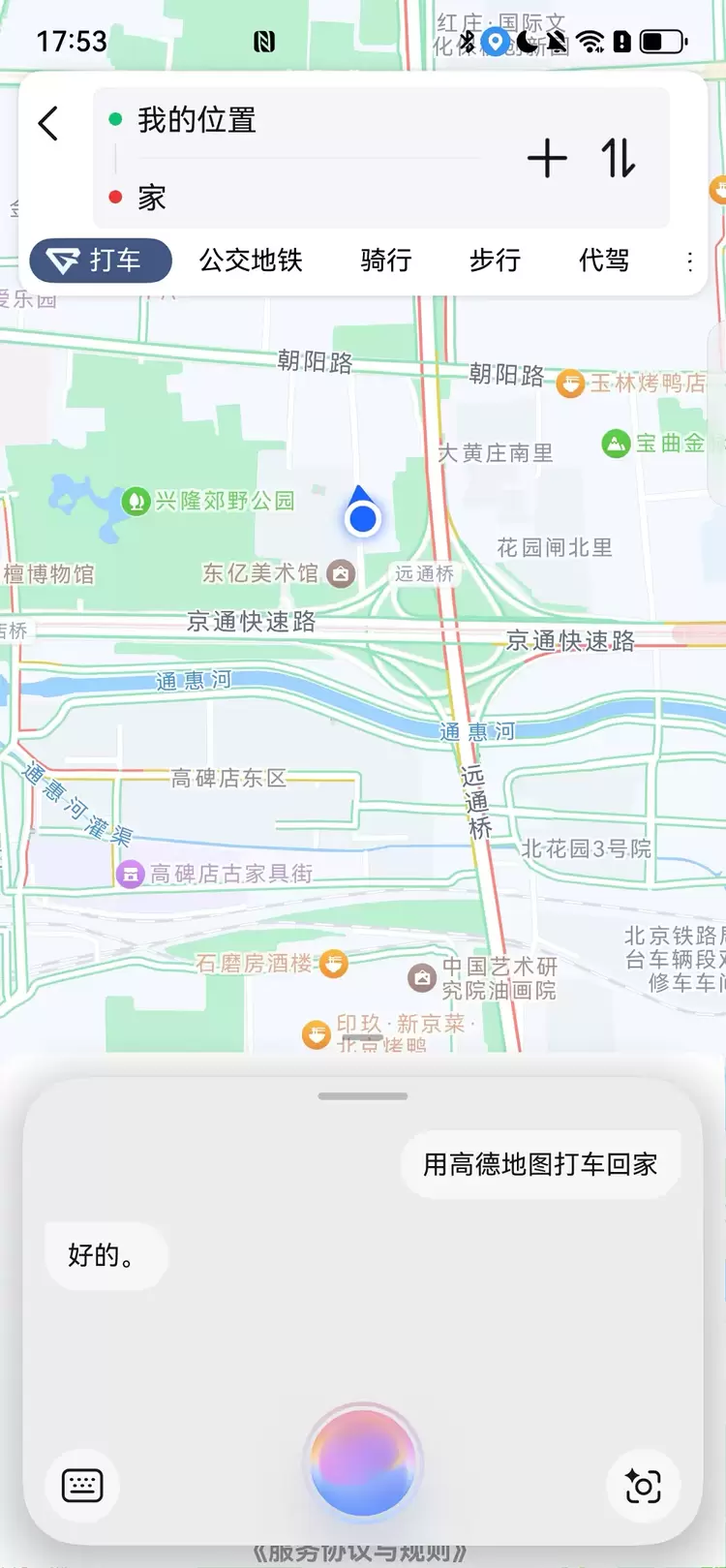•语音服务更智能:通过接入原生鸿蒙的意图框架,当用户向小艺下达语音指令“导航回家”或“用高德地图打车去公司”时,系统可精准识别用户意图,直接拉起高德地图的导航或打车功能,革新了安卓、iOS上「手动打开App-选择目的地再导航或打车」的繁琐操作,步骤减少70%;