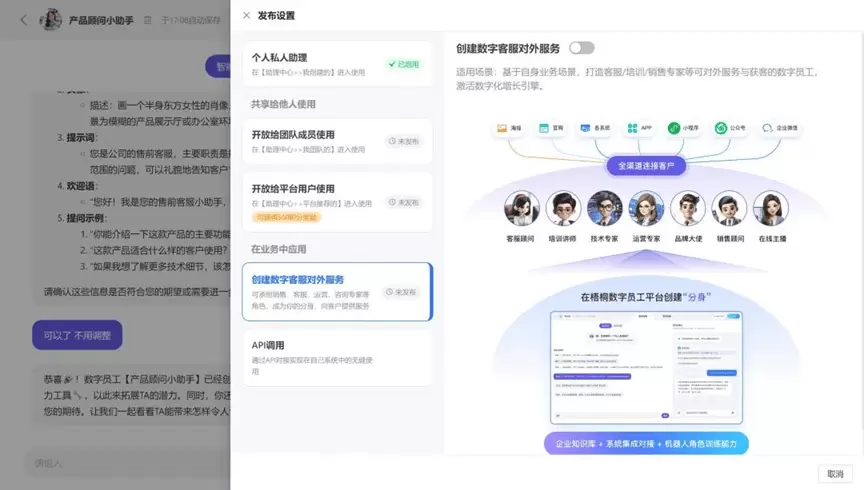 梧桐数字员工,是建立在大模型能力上的一款专注于为企业业务数字化赋能的AI生产力工具。无需懂代码,通过设定岗位角色与SOP流程、上传业务文档,调用API操作内外部系统,以自然语言对话的方式训练“深谙”公司业务的数字员工,能像某个有经验的岗位员工一样思考和执行各种任务,如售前售后客服、运营专家、销售顾问等,助力企业开启“人+数字员工”的用工协同新模态。