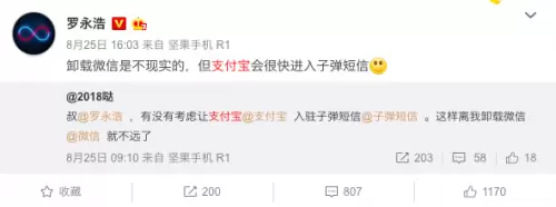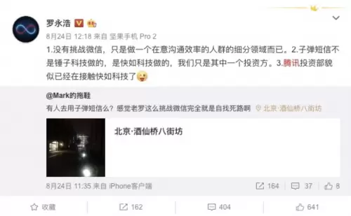 老罗之前也说过,支付宝会很快进入子弹短信。如此看来,阿里早早就已经接触快如科技了。行业人士都知道,阿里早已经对“微信”各种羡慕,支付宝也一直在社交上作出的尝试,从种树到生活圈再到五福,但都难以撼动微信的霸权。而火爆的子弹短信,让阿里感觉到如今好不容易出了一款可能与微信一较高下的APP,自然是想要将其纳入纳入麾下的,而子弹短信如果经过阿里之手,难保真的会和微信分天下。