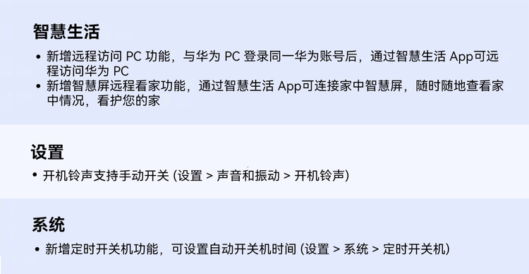 升级HarmonyOS NEXT 5.0.0.126SP8后还支持定时开关机功能、开机铃声手动开关等,让用户的一些基础体验得到优化提升。另外系统还新增了远程访问PC功能,用户在外出或远程办公时可轻松访问和操作家中的华为PC,实现文件的远程传输、编辑和管理等操作,该功能需要双端设备登录同一华为账号,同时将华为PC的“远程PC”开关打开。而智慧屏远程看家功能,让用户可随时随地查看家中的情况,外出更安心。
