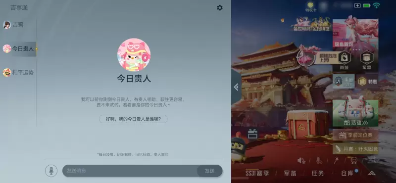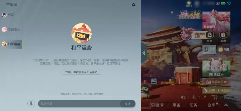 作为《和平精英》上线六周年的重磅创新,游戏大厅将开启“吉事通”入口,依托DeepSeek的多模态大模型技术,实现与玩家的自然语言对话、战术指导,玩家可与吉莉实时交流,获取包括游戏福利资讯、最新玩法介绍、武器搭配推荐、战术策略教学等深度游戏支持。“吉事通”入口内还有“今日贵人”“和平运势”两种个性化娱乐互动,为玩家提供更多趣味体验。
