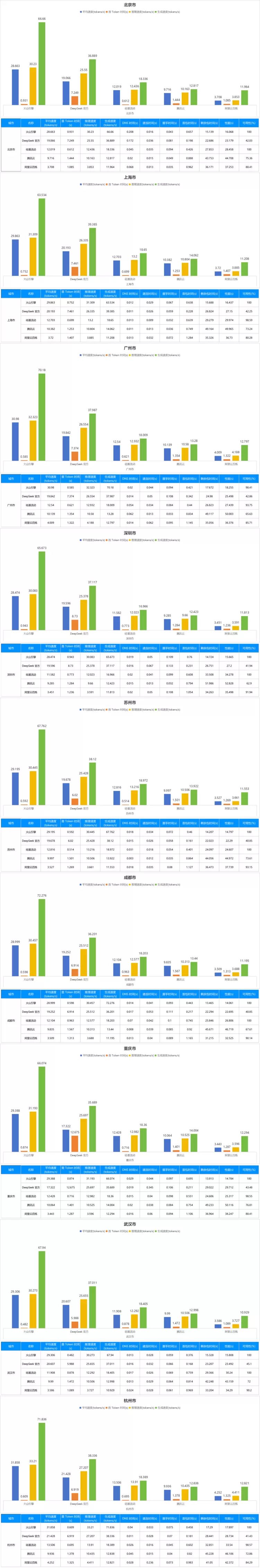 2. DeepSeek 官方在重庆的首 Token 时间最长12.675 秒,其他城市均在9秒内。