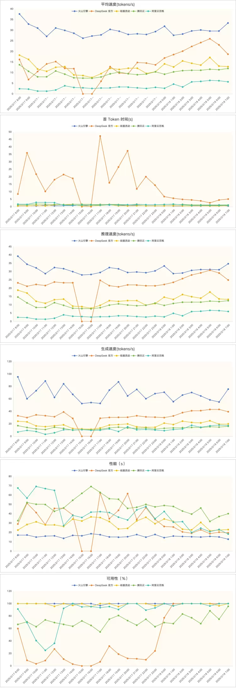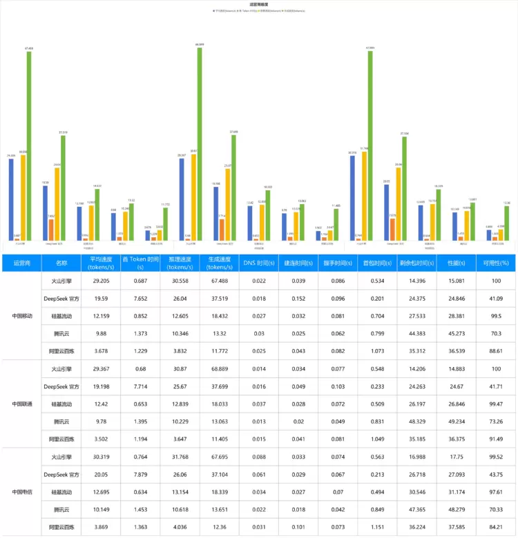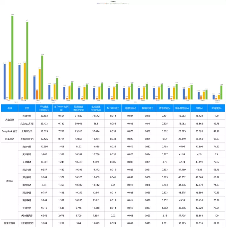 2. DeepSeek 官方推理速度较快,但首 Token 延迟显著(7.753s),可用性最低(42.21%)。
