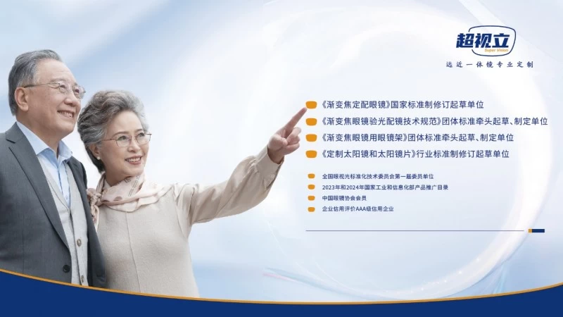 超视立是《渐变焦定配眼镜》国家标准制修订起草单位、《渐变焦眼镜验光配镜技术规范》团体标准牵头起草、制定单位、《定制太阳镜和太阳镜片》行业标准制修订起草单位。