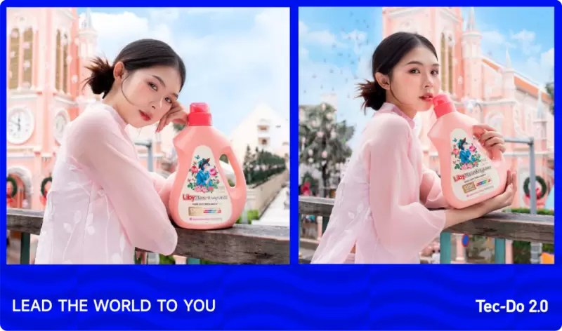 钛动科技旗下PRISM工作室策划并制作与奢侈品香水同样的CGI视频内容,选址于越南地标建筑-胡志明粉红教堂。画面中,随着洗衣液的流动,地面上开始绽放出玫瑰花,花朵缓缓铺开,蔓延至街道、建筑周围,最终围绕整个粉红教堂展开。玫瑰花为立白大师香氛的香型也是重要的卖点,传递出奢华、持久的香气,彰显产品高端调性。