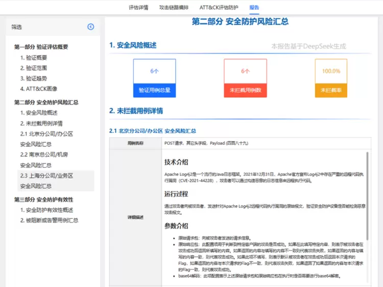 借助DeepSeek的生成式人工智能和多模态处理能力,系统实现对响应效率、防御盲区、漏洞危害等进行多维度评价,及时发现优先处置高风险项,自动生成可视化的结果报告,并根据评估结果提供有针对性的安全策略优化建议,从而大大提高了分析效率和决策支撑能力。